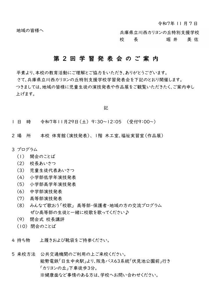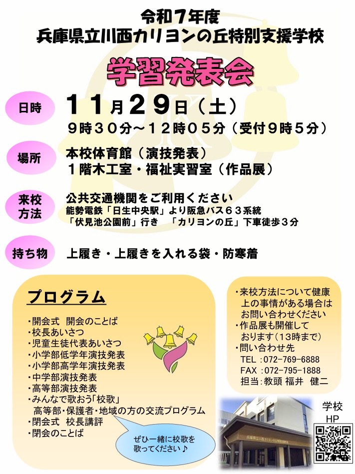 11月29日(土)9時30分~12時5分(受付9時5分) 兵庫県立川西カリヨンの丘特別支援学校において、令和7年度学習発表会が開催されます。当日は児童生徒の演技発表や作品展があります。子どもたちは演技の練習を毎日一生懸命頑張っています。ぜひ皆さんお誘い会ってご参加下さい。